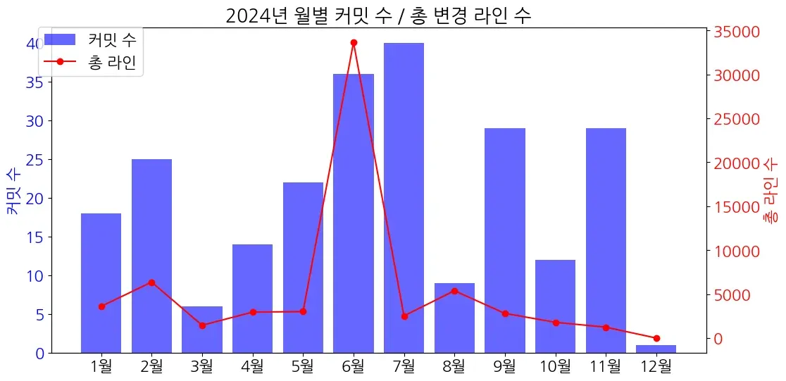 2024년 동안의 월별 커밋 수와 변경된 라인 수를 분석하여, 어떤 시점에 많은 작업이 이루어졌는지를 한 눈에 알 수 있었다. (회사에서 주로 작업한 레포의 main 브랜치 기준)