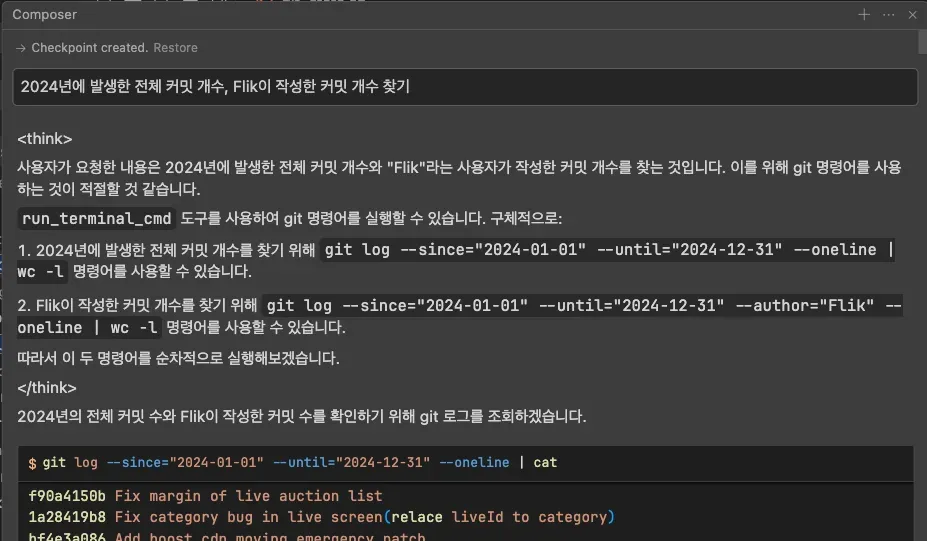 사실 이번 작업에서 cursor가 레포지토리 전체를 100% 다 확인하지는 못하는 것 같았다. 연간 작성한 코드를 리뷰하기에는 너무 방대하기 때문에 그러지 않았을 것이다.