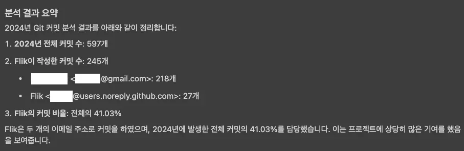 프롬프트: 2024년에 발생한 전체 커밋 개수, Flik이 작성한 커밋 개수를 찾아줘