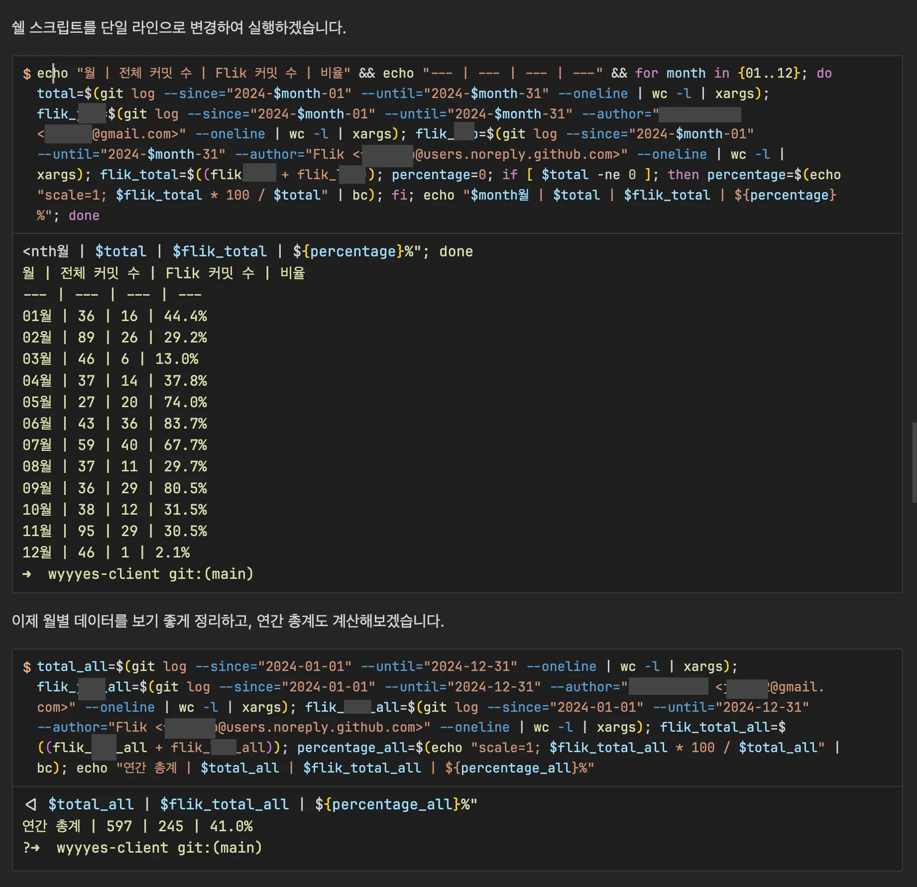 커서가 예상대로 git 명령어를 사용하는 쪽으로 생각을 전개했고, 생각보다 쉽게 한 해동안 작성한 커밋 수를 얻을 수 있었다.